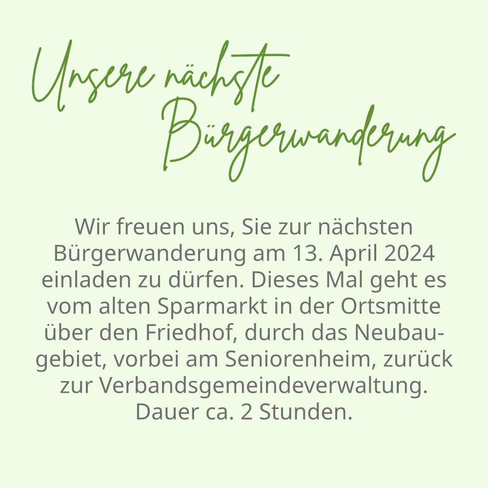 Bürgerwanderung mit aktuellen Informationen zur Dorfentwicklung. Vom alten Sparmarkt über den Friedhof, durch das Neubaugebiet, am Seniorenheim vorbei, zurück zur Verbandsgemeinde.